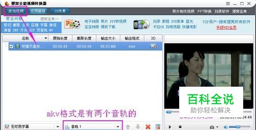接着添加进来的mv软件会检测该mv歌曲是否为原伴唱音轨,然后在下面点击下面可以查看音轨1和音轨2,然后选择伴唱的音轨即可。