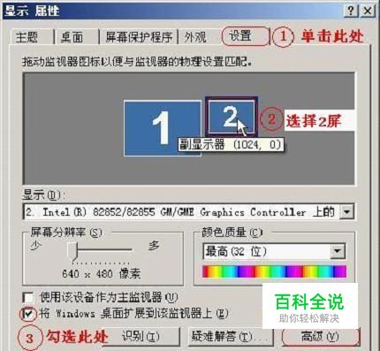 在出现的对话框中,选择“设置”——选择“2屏”——勾上“将Windows桌面扩展到该监视器上”前面的方框——单击“应用”——单击“高级”(如图:①②③④⑤);