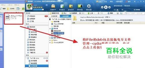 连接iPhone到电脑,点击文件管理—cydia软件安装—将iFile的deb包拖曳进入,或者点击上传按钮上传。