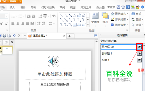 2.在菜单栏中,点击【开始】选项卡,【选择】→【选择窗格】,在演示右边的【选择窗格】任务栏中选中该对象,点击小方框中的眼睛图标即可将其隐藏。我今天给大家介绍第二种方法。