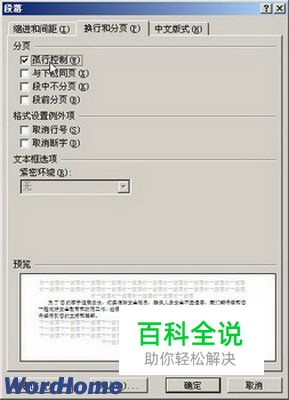 第2步,在打开的“段落”对话框中切换到“换行和分页”选项卡,在“分页”区域含有4个与分页有关的选项,每项的功能如下: (1)孤行控制:当段落被分开在两页中时,如果该段落在任何页的内容只有1行,则该段落将完全放置到下一页; (2)与下段同页:当前选中的段落与下一段落始终保持在同一页中; (3)段中不分页:禁止在段落中间分页,如果当前页无法完全放置该段落,则该段落内容将完全放置到下一页; (4)段前分页: 根据实际需要选中合适的复选框,并单击“确定”按钮即可。