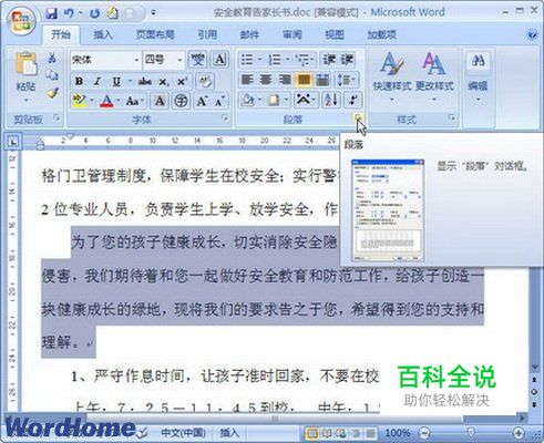 第1步,打开Word2007文档窗口,选中需要设置分页选项的段落或选中全文。在“开始”功能区单击“段落”分组中的显示段落对话框按钮。