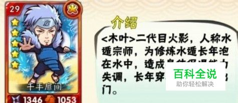 《我是火影》二代火影:千手扉间,五星红色卡牌。 人物介绍:<木叶>二代目火影,人称水遁宗师,为修炼水遁长年泡在水中,造成身体保温能力失调,长年穿着毛皮大衣出门。 忍术介绍: 1、硬涡水刃:S级忍术,战斗中有32%几率增加自己15%攻防值,并减少当前对阵忍者的15%攻防值。 2、飞雷神之术:A级忍术,战斗中有15%几率增加自己85%攻防值,次回合攻防值减少为剩余的50%。 组合技能: 1、雷火同盟:与<三代雷影>同时上阵提高攻击力41% 2、师与徒:与<猿飞日斩>同时上阵提高攻击力45% 3、千手兄弟:与<千手柱间>同时上阵提高攻击力45% 4、雷神之剑:装备<雷神之剑>提高攻击力45%