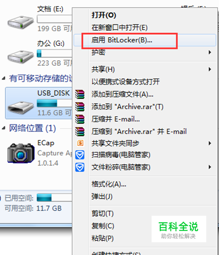 首先将U盘连接到电脑,在需要加密的U盘处,使用鼠标右键点击“启用BitLocker”选项。