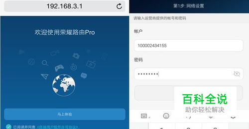 第三步,输入账号名称、密码。首先在荣耀路由Pro的底座上找到产品的WiFi名称,用手机连接相应的WiFi网络,接着打开手机网页浏览器(浏览器会自动跳转到设置界面),输入家中宽带的“上网账号”和“上网密码”。