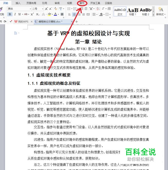首先,打开所要添加目录的word文档,点击最上方菜单的“章节”选项。
