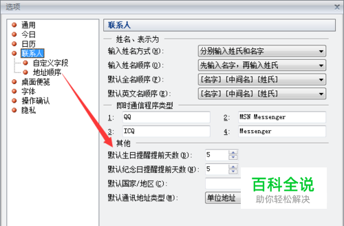 运行高效e人后,点击 工具-> 选项-> 联系人,设置默认生日提醒提前天数。