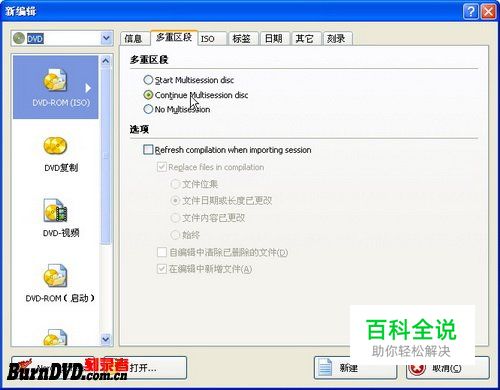 第2步,打开“多重区段”选项卡,在“多重区段”区域选中“Continue Multisession disc(继续刻录多重区段光盘)”单选框。其他选项可以保持以前的设置,单击“新建”按钮,如图2009020438所示。 图2009020438 继续刻录多区段光盘