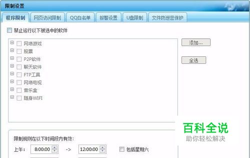 点击”限制设置“,可以对员工电脑的操作进行限制,如限制能或不能访问某些网站,运行或不能运行某个程序等。