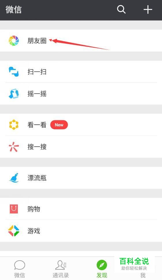 打开微信手机客户端之后,单击面板上的“发现”按钮,会看到有一个“朋友圈”选项卡,单击该选项。