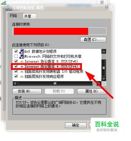 在无线网络属性选择“Internet 协议版本 4 (TCP/IPv4)”选项