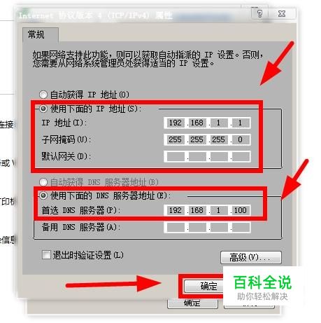 选择“使用下面的IP地址”: IP地址输入:192.168.1.1 子网掩码输入:255.255.255.0 使用下面的DNS服务器地址: 首选 DNS 服务器输入:192.168.1.100 最后点击“确定”