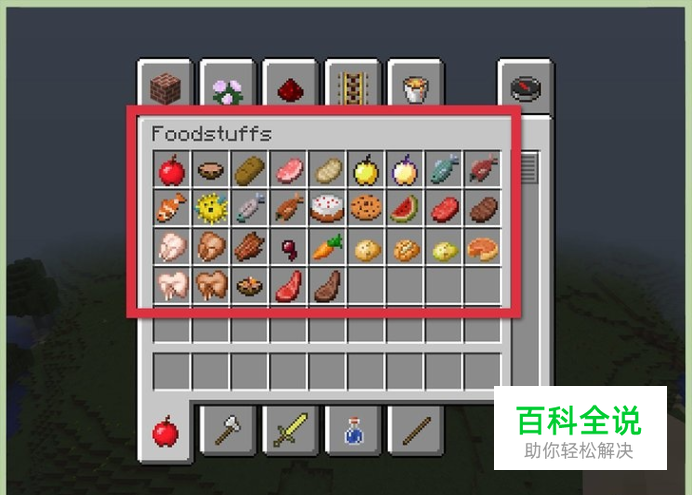 找到或选取一项食物。Minecraft中有很多食物可选,从苹果到牛排应有尽有。 很多食物(和原材料)可以放在背包中。不能被储存的食物包括:蘑菇煲、蛋糕和牛奶