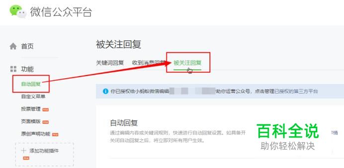 登陆微信公众平台,点击自动回复,选择“被关注回复”。