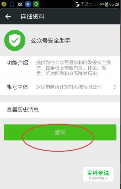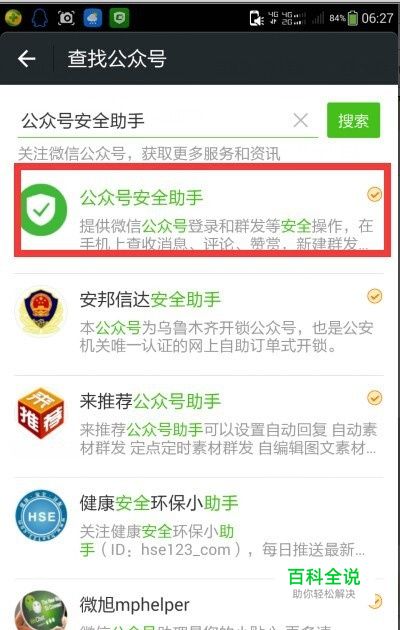 搜索出来的结果如下图,点击第一个【安全助手公众号】,然后点击“关注”。