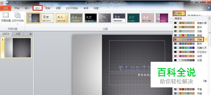 1、新建一个ppt文档,在设计选项卡下的主题列表中选择主题。