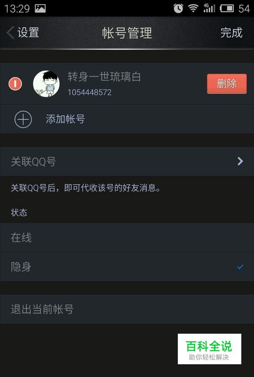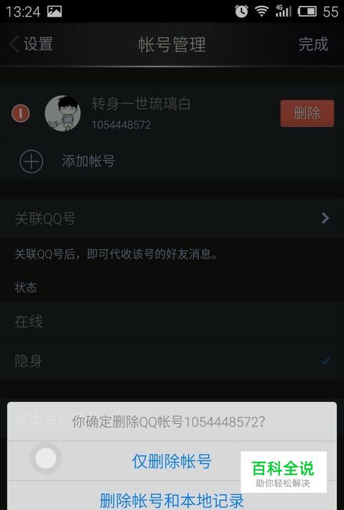 那里有个红--的选项,我们点击他帐号后面会出现删除选项,这里就不用多说了直接点击删除,会出现两个选项仅删除帐号和删除帐号和本地记录,我们视个人情况选择,如图所示。