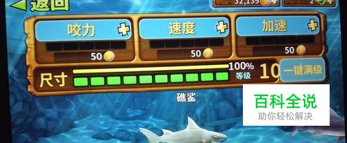 然后是初始鲨鱼:礁鲨,作为入门级的鲨鱼,血槽最短。各种吃东西吧,凑够2000金币买个基本地图,这个会方便很多。咬力加速那些就不用花钱了,因为满级就能到下一条鲨鱼。再有钱就买个眼罩~