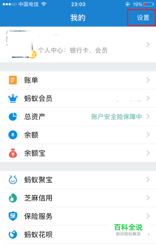 首先登录手机支付宝,点击进入我的,在界面的右上角,点击设置。