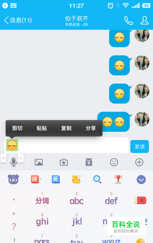 首先在输入框输入【害羞】表情,目前测试只有这个,选择全选-复制/剪切