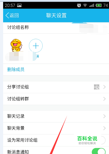 回到聊天设置之后,我们点击最下方的“退出讨论组”,如图示。然后我们的这个讨论组就不存在了。