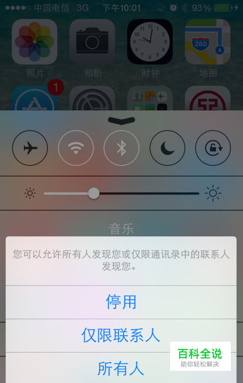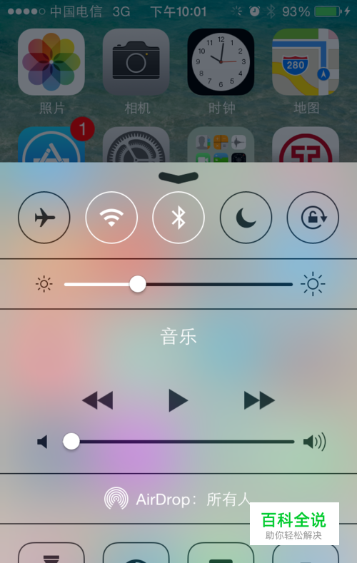 打开苹果设备的控制中心,手指在屏幕底部向上滑动,出现以下界面,点击AirDrop,出现一个选择菜单,这里选择“所有人”,这样AirDrop的设定完成了。