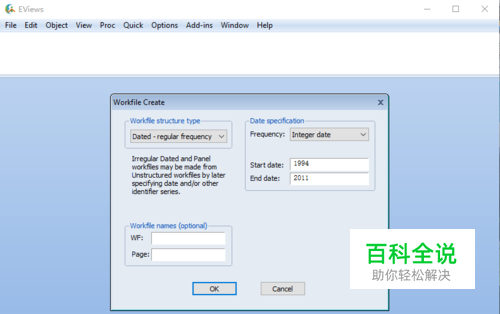这里我们分析的是横截面数据,所以选择“integer date”,在"start date"输入开始的年份,在“end date”输入结束的年份。点击“OK”