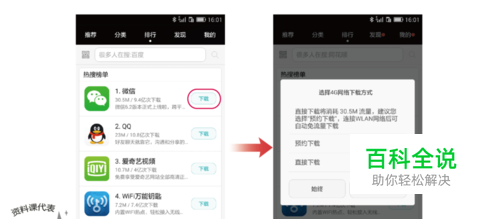 如果当前使用的是移动网络,您可以选择【预约下载】(连接到 WLAN 之后才自动启动下载)或者【直接下载】(使用移动网络数据业务下载,耗费套餐流量)。您可以根据自己的套餐以及流量余额情况选择下载类型。 从状态栏向下滑动打开通知面板,在【通知】页面,可以查看应用程序下载和安装进度。 下载完成之后,应用程序会自动安装。安装完成之后,主屏幕上会出现应用程序图标。