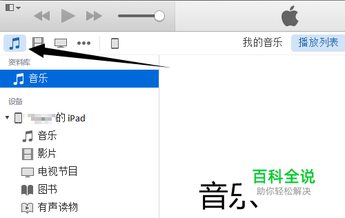 由于无法直接通过复制粘贴的方式把歌曲导入到iPad,因此我使用iTunes同步的方式把歌曲导入,iPad与电脑连接后自动打开iTunes点击【音乐】。