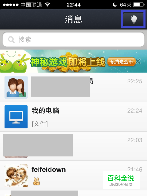打开 QQ 以后点击屏幕左下角的 “消息”按钮,再点击右上角的 “灯泡”按钮,如图所示