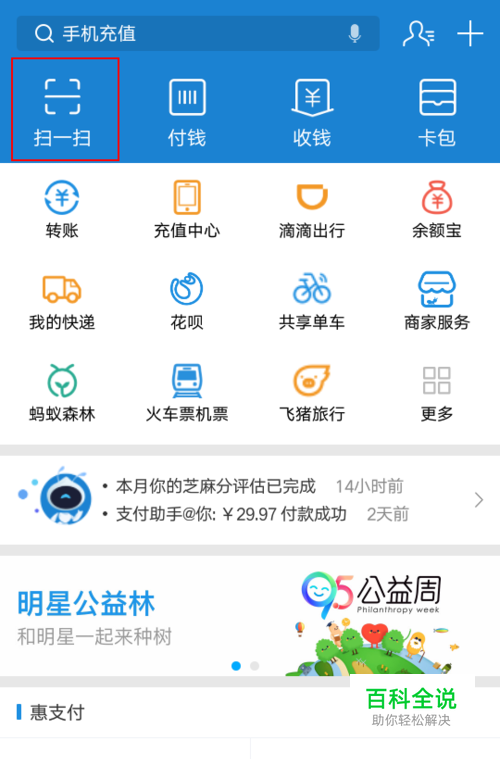 方法①打开支付宝首页>【扫一扫】。打开扫一扫功能,扫描店家提供的收钱码或者店家用手机给你出示的二维码,然后输入金额完成付款。