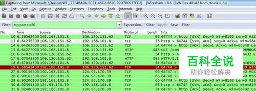 端口过滤。如过滤80端口,在Filter中输入,tcp.port==80,这条规则是把源端口和目的端口为80的都过滤出来。使用tcp.dstport==80只过滤目的端口为80的,tcp.srcport==80只过滤源端口为80的包;