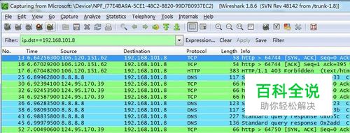连接符and的使用。过滤两种条件时,使用and连接,如过滤ip为192.168.101.8并且为http协议的,ip.src==192.168.101.8 and http。