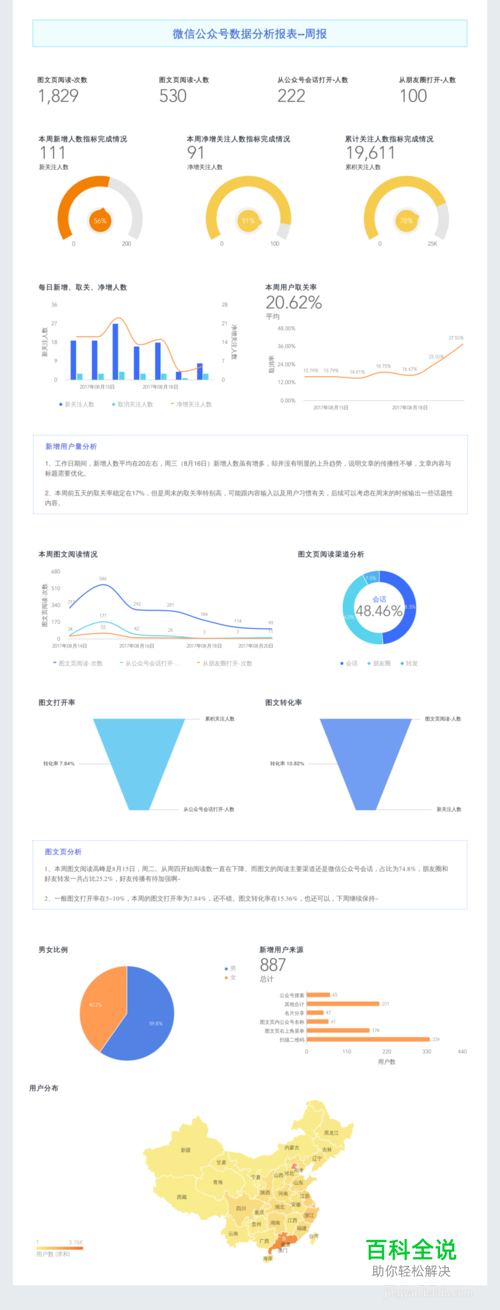 自从新媒体兴起后,越来越多的人选择进入新媒体行业,而制作直观且高效的数据报告则是一个“大坑”。不仅是因为老板要经常看报告,更是因为这些数据可作为优化公众号运营的参考依据,因此制作公众号数据分析报告的重要性就不言而喻了! 公众号的数据分析报告主要包含哪些内容呢? 用户分析:包含新增用户,新增用户来源渠道,累计关注人数、用户性别占比,省份、城市、地域分布等等等等; 图文分析:图文页阅读、图文转化率、原文页阅读人数、原文页阅读次数、原文转化率、分享转发人数、分享转发次数等等; 菜单分析:菜单点击次数、菜单点击人数、人均点击次数等; 以上只是常见的数据指标,需要“因地制宜”哈~