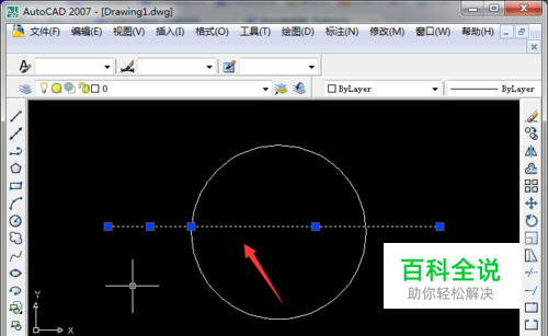在下图的一条直线和圆组成的图形中,我们是可以看到直线是连续的,现在我们就要在直线和圆的交点上进行打断。
