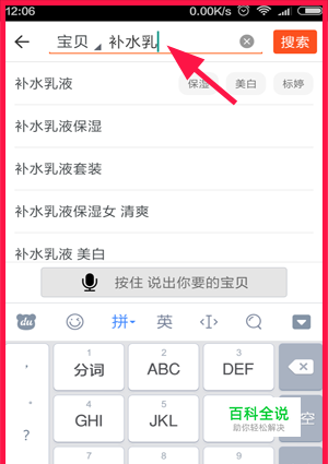 在首页搜索栏里输入想购买的商品。这里用补水乳液举例。