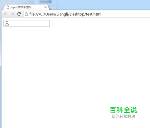 页面所有代码。如有不懂可把页面所有代码复制到新建的html文件后即可看到效果。(注意:小编没有把小图标的图片上传,复制所有代码后需要把引入图片修改为本地的图片路径哦 【background-image: url(图片路径)】) 所有代码: <!DOCTYPE html> <html> <head> <meta charset="UTF-8"> <title>input添加小图标</title> <style> .div-bor{ position: relative;width: 200px; } .icon-user{ position: absolute;left: 0;z-index:5; background-image: url(user.png); /*引入图片图片*/ background-repeat: no-repeat; /*设置图片不重复*/ background-position: 0px 0px; /*图片显示的位置*/ width: 20px; /*设置图片显示的宽*/ height: 20px; /*图片显示的高*/ } .user{ padding-left: 22px; } </style> </head> <body> <div> <i></i> <input type="text" /> </div> </body> </html>