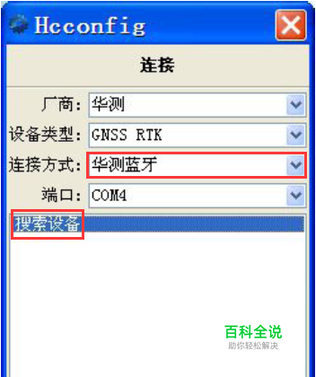 首先设置基准站,打开"Hcconfig",点“连接”,选择连接方式“华测蓝牙”,点击“搜索设备”,搜索到基准站后,点击下方的“连接”。