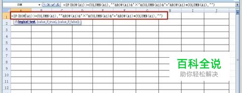 打开 EXCEL文件,选择A1单元格,输入公式: =IF(ROW(A1)>=COLUMN(A1),""&ROW(A1)&"×"&COLUMN(A1)&"="&ROW(A1)*COLUMN(A1),"") 说明: IF是判断函数,ROW是取行号函数,COLUMN是取列号函数。