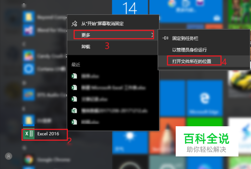 点击Windows图标,在所有程序中找到Excel,如下图,点击“更多”下的“打开文件所在的位置”。