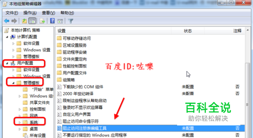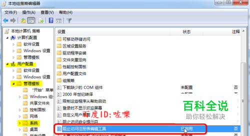 打开本地组策略编辑器,依次找到如图 计算机配置---用户配置---管理模板---系统--- 组织访问注册表编辑工具