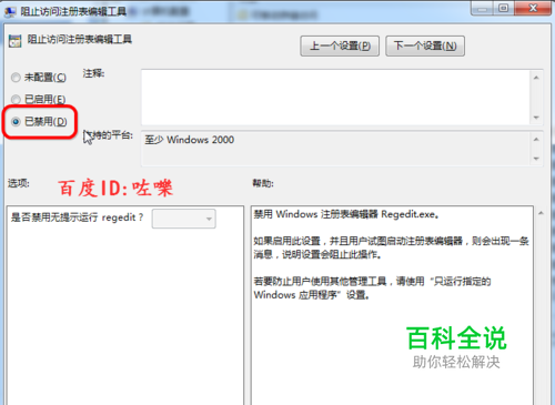 禁用设置 点击阻止访问注册表编辑器工具,设置为禁用或者未配置,然后保存