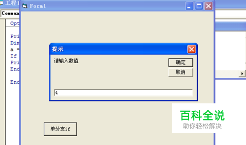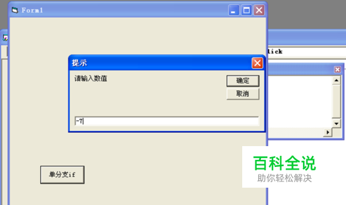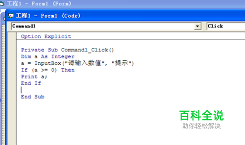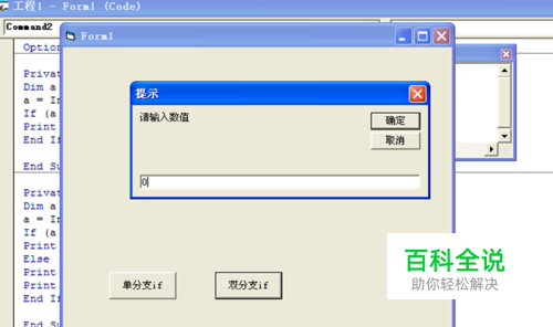 在工具箱里双击按钮控件,选中该按钮然后在属性窗口修改其caption属性值为双分支if,双击其按钮进入代码区域,书写代码为 Dim a As Integer a = InputBox("请输入数值", "提示") If (a >= 0) Then Print a; Else Print Print -a; End If 点击工具栏中的启动按钮进行运行测试。