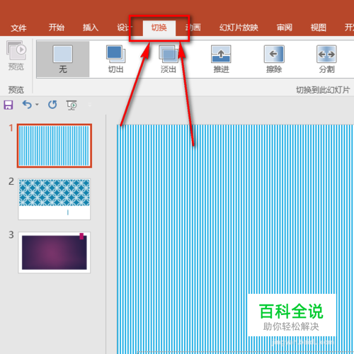 然后我们选中第一张幻灯片,并且选择好界面中的“切换”菜单便可。