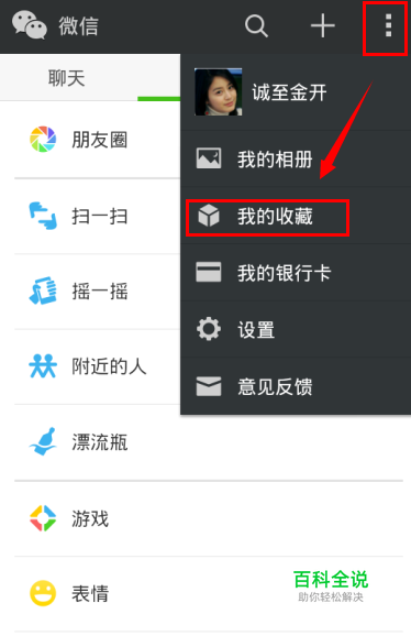 登陆打开微信首页,将页面切换到发现栏目,点击右上角的三点成柱状的图标,选择下拉菜单中的我的收藏
