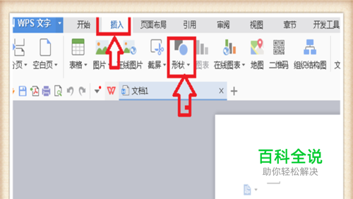1、打开WPS软件,新建空白文档,找到插入,单击一下,再找到“形状”,单击一下。