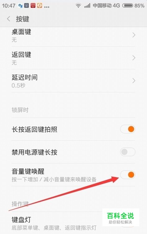 在按键窗口中,向下拉动屏幕,可以看到“音量键唤醒”菜单项,其右侧为打开开关,点击后即打开音量键唤醒功能
