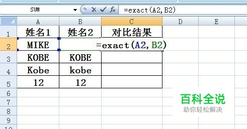在excel中exact函数可以用来对比两个单元格中的文本内容是否一致,如果一致则返回TRUE,否则返回FALSE。 语法: exact(text1,text2) 其中 text1和text2表示要对比的两个字符串。