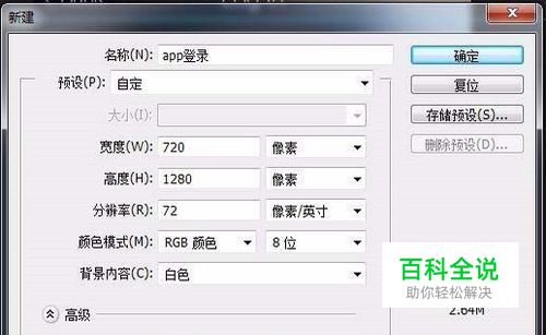 1、开PS软件,在操作面板上点击,新建potoshop文件,大小为720*1280分辨率为72。