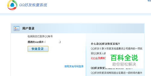 这里,我们通过QQ好友恢复系统来达到这个查找自己退出的QQ群的目的。那么,我们首先登陆这个QQ好友恢复系统,当然要使用自己的QQ号码来登录了。